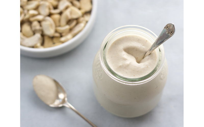 Într-un mic robot de bucătărie sau într-un blender portabil mixați nucile caju, apa, sucul de lămâie, muștarul, pudra de usturoi și sarea de mare fină.